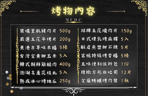 醬燒里肌豬肉片500g、嚴選五花牛烤片200g、東港古早味米腸5條、韓式朝鮮雞腿肉400g、台灣黃金甜玉米5入、澎湖名產花枝丸5入、熟成冰心烤地瓜250g、 日式煉乳烤麻糬5入、招牌五花燒肉片150g、酥皮魚漿甜不辣5片、富統特級烤香腸5條、五味便利佐料包1份、精緻方形白吐司12片、金蘭純釀烤肉醬1瓶